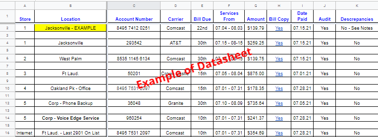 As part of our auditing services, we provide you with a comprehensive monthly datasheet detailing the billing particulars for each location. This datasheet consolidates all necessary information into a single spreadsheet, including bill copies, amounts due, payment dates, and any notable details such as discrepancies.
